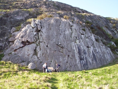 The larger wall on the left with overhangs at ground level at the right and many overlaps in the middle at half height. This wall is home to the local classics Piglet (HVS 5b ***) and Great Corner (S ***).
